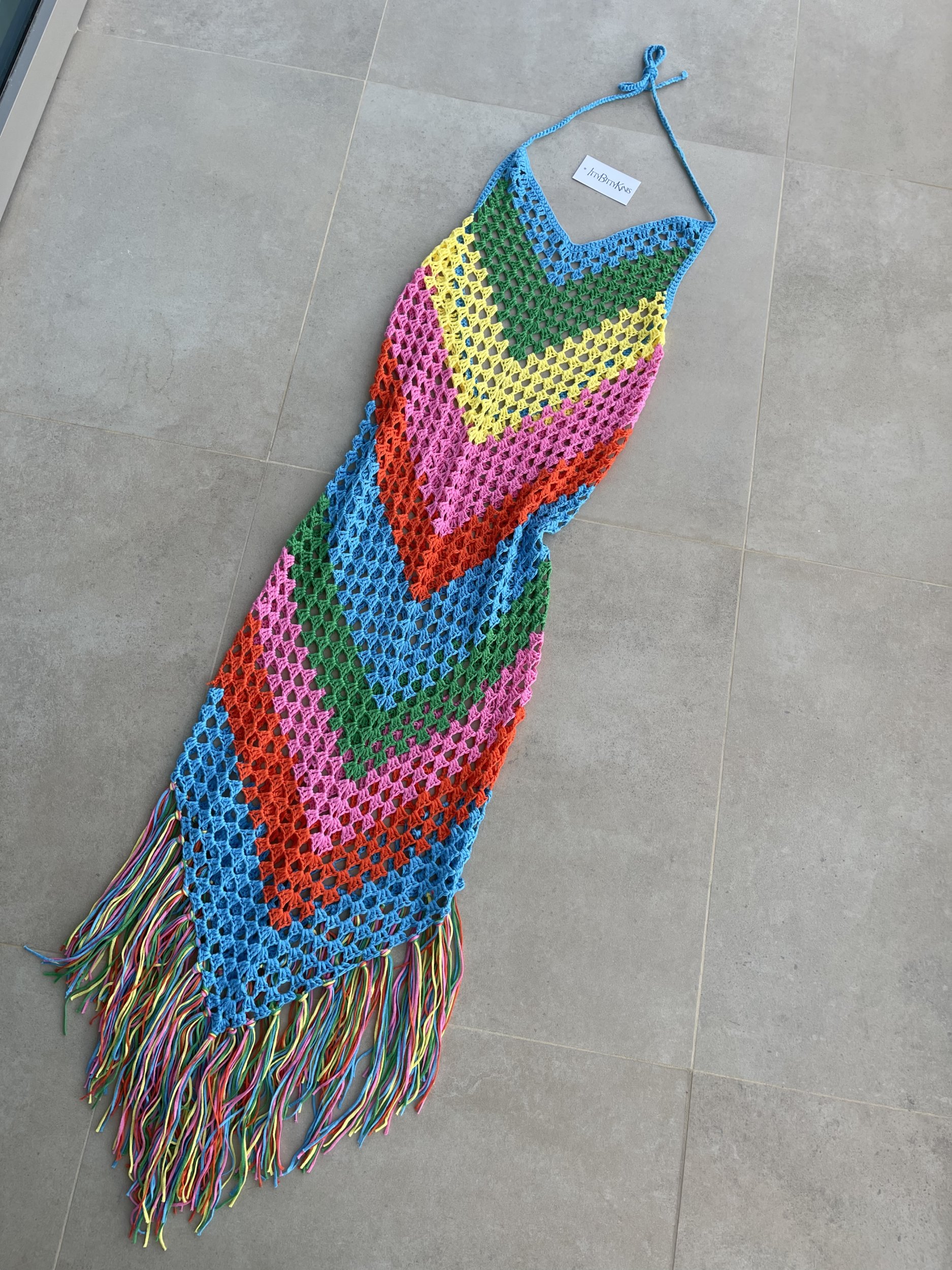 This handmade crochet dress is the perfect cover up with a backless detail, pair this with your favourite kini and a hat for the ultimate beach babe look.