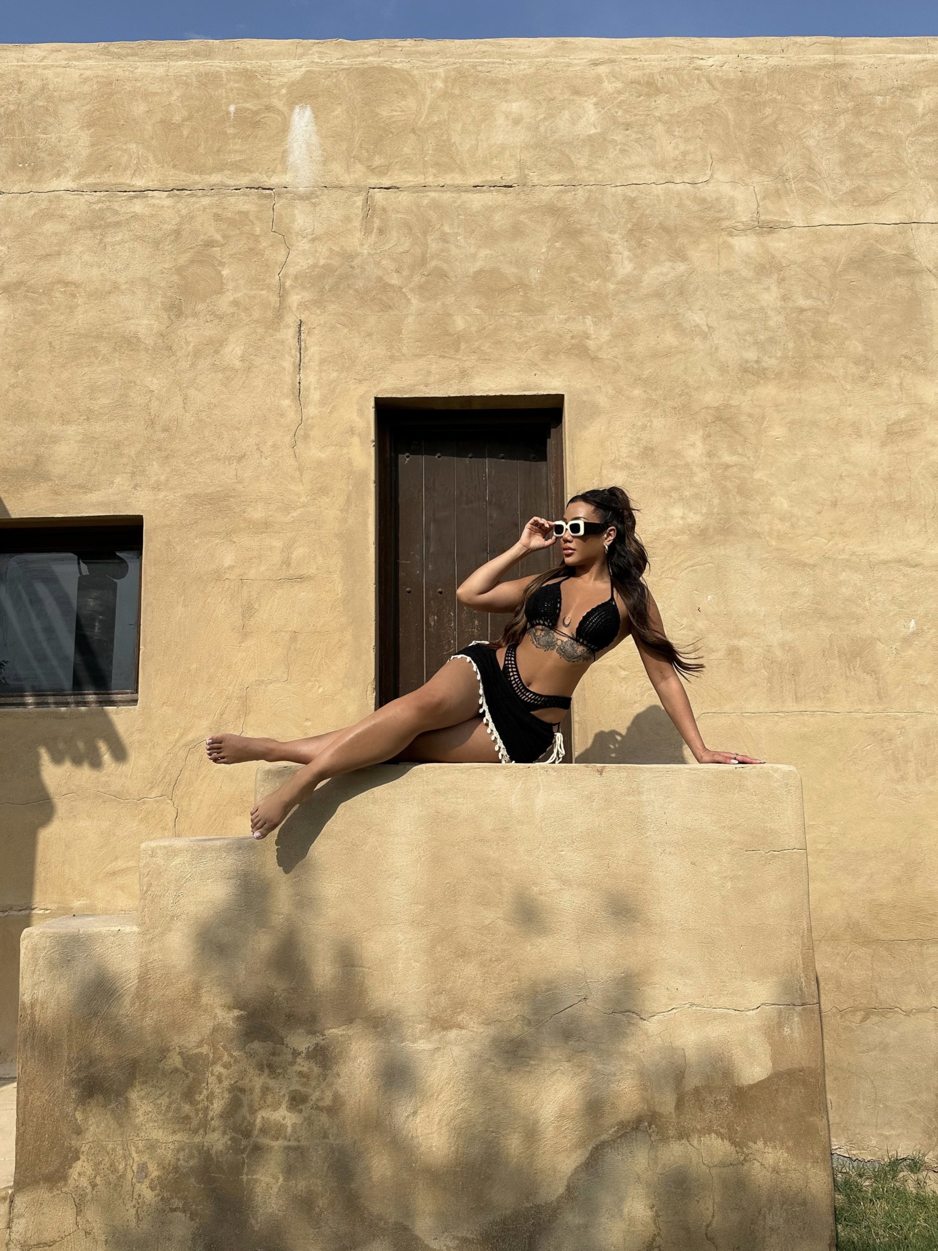 This beautiful new crochet 3 piece set has a shell detail on the bottom of the mini skirt. The bottoms are stretchy and slip on with lining in and the top had padding.
