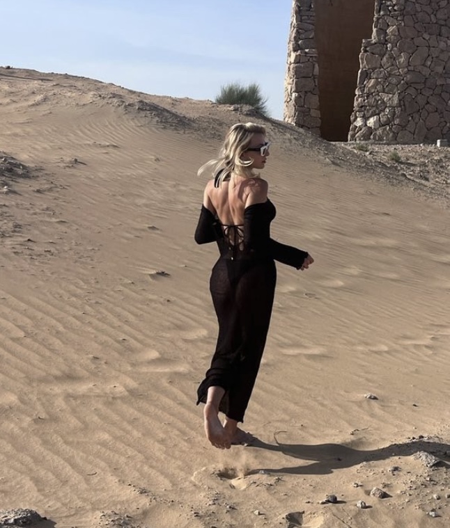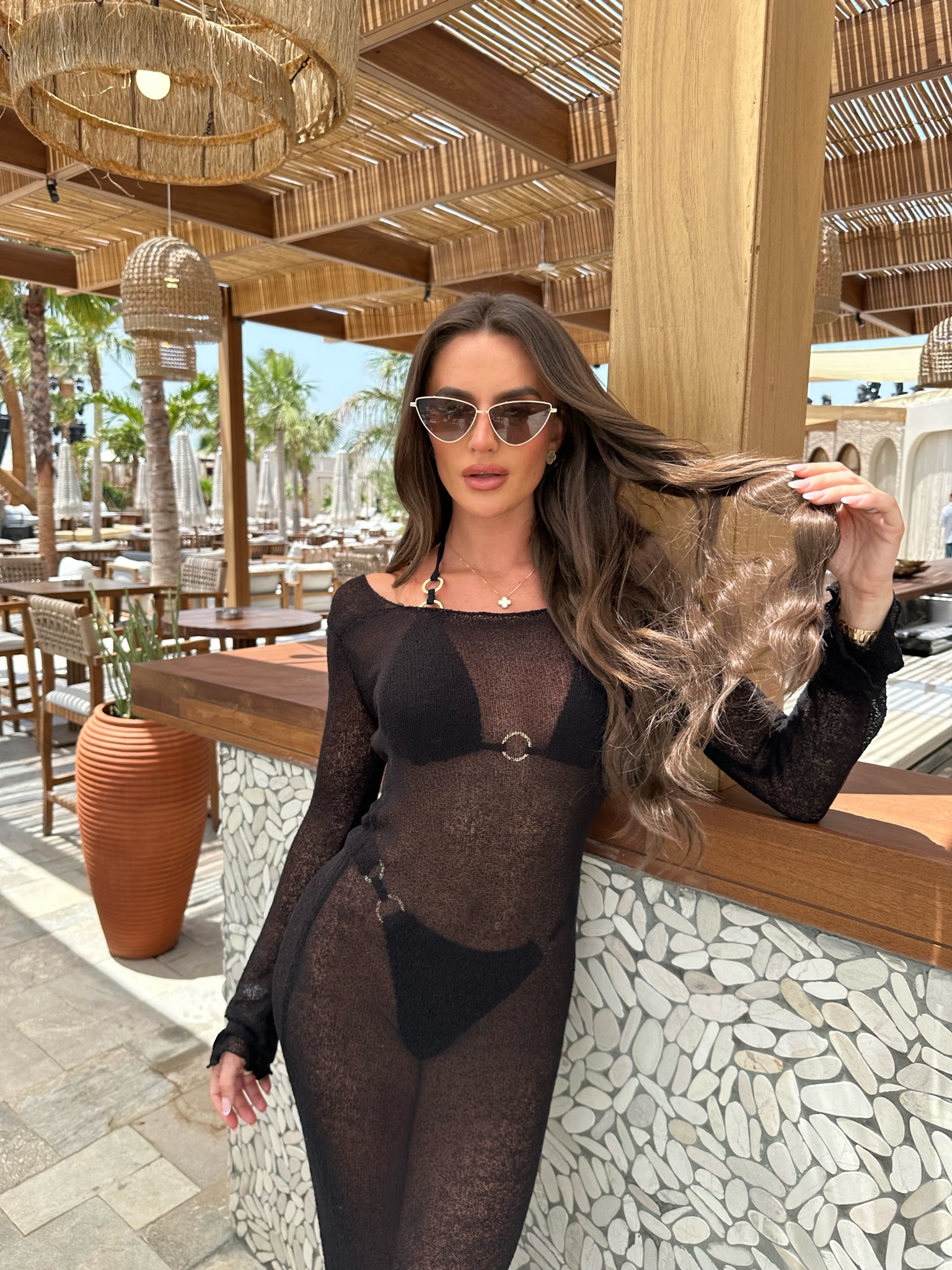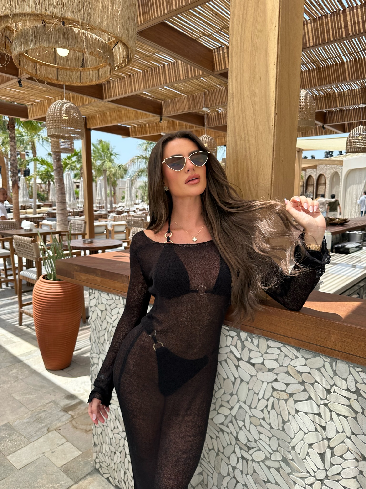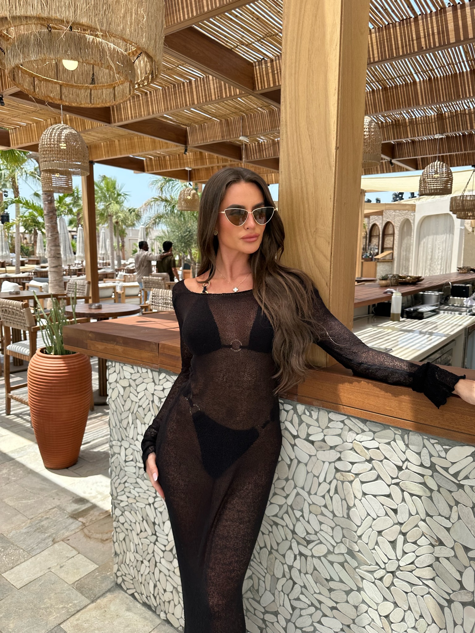 This dress features a backless detail with long sleeves. The fabric is a super soft stretch knit, model is wearing a size small.